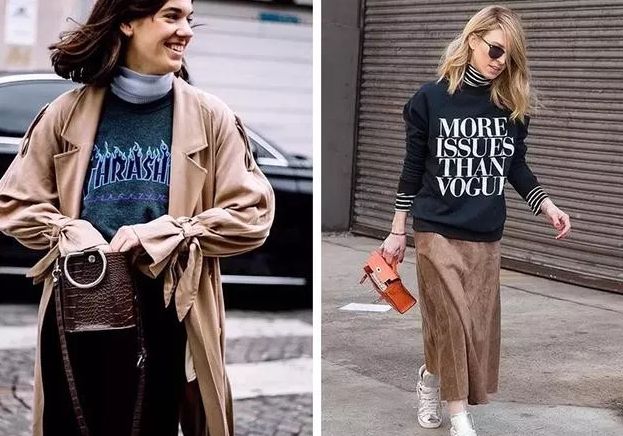 也可以像技巧一一样卫衣内搭高领,但这对组合想穿出彩,就要选择同色系不同深浅进行混搭,给人一种假两件的感觉,和谐统一又不失时髦感。