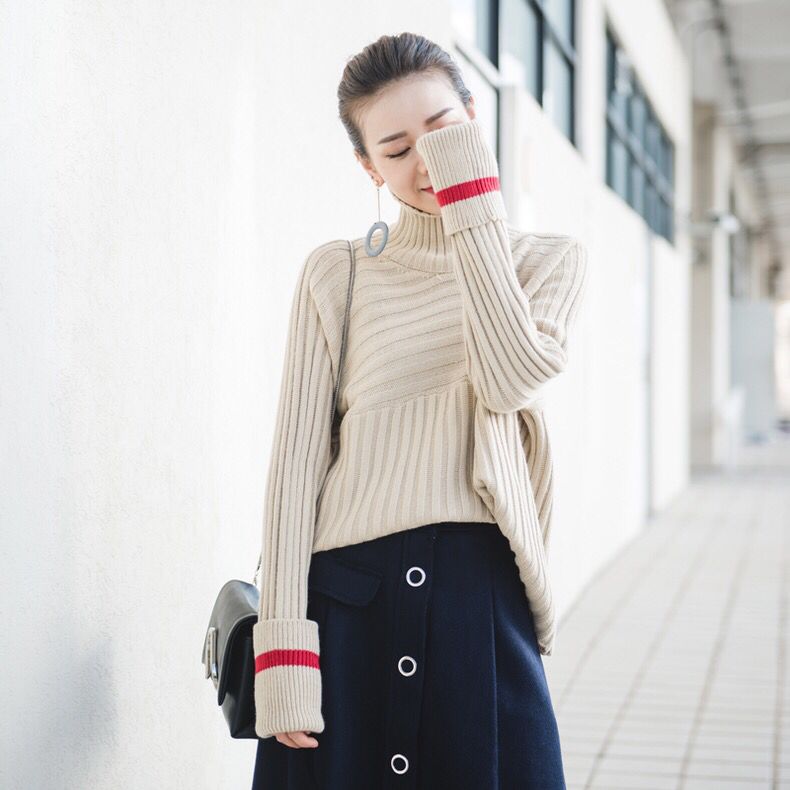 毛衣纹路横竖拼接,面料非常亲肤,袖子红色撞色条纹,很时尚,袖子是高挽袖,全部放下来就是今年大热的慵懒风超大袖,每个人都应该在秋冬拥有一件大毛衣,韩剧女主角不都拿毛衣当主打么,相对于外套,毛衣更能诠释女生的温柔细腻。