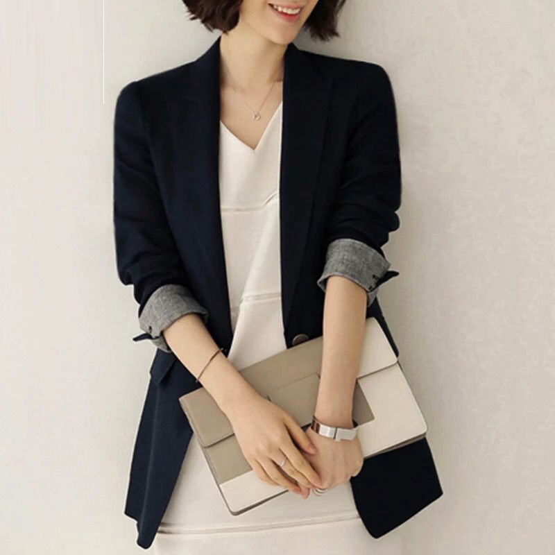 黑色的西装有时会显得过于沉闷单调,而藏青色在沉稳的同时更凸显时尚。长度刚好过腰,有效提升了休闲感觉,简单的设计搭配上V领的内搭,洒脱又浪漫。袖子口的卷边亮点,点缀了整体,看起来干脆利落的同时也多了几分活力。