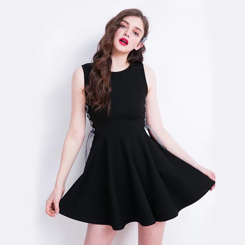 小黑裙可以说是最经典的气质连衣裙之一啦。自赫本将它穿成经典之后,一直流行到现在,小黑裙的魅力是无可取代哒。这款小黑裙在经典款的基础上加了一点创新改动,腰部两侧加上两条格子绑带,成就了另一种风味哦。