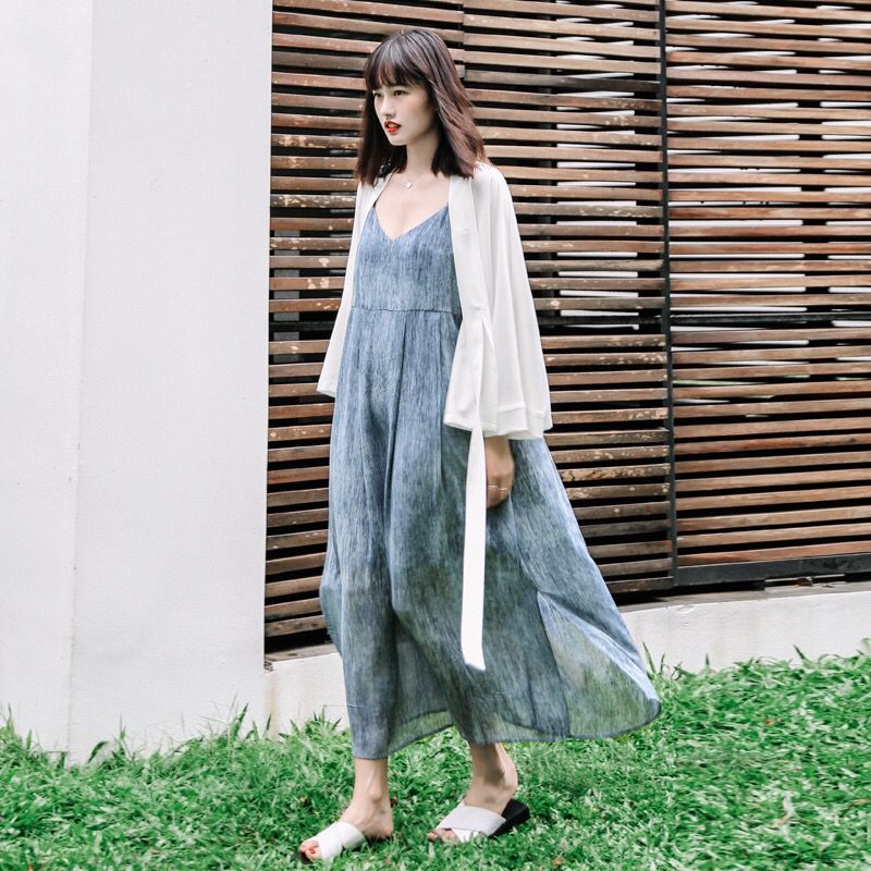 这款连衣裙可是用到了经典的中国元素哦。淡雅的水墨在柔软的布料上缓缓散开,水纹灵动自然,仿佛有着自己的呼吸起伏。吊带款的设计穿着非常有设计感,质感也是超一流。长至脚踝加上超级大裙摆,气质超显!