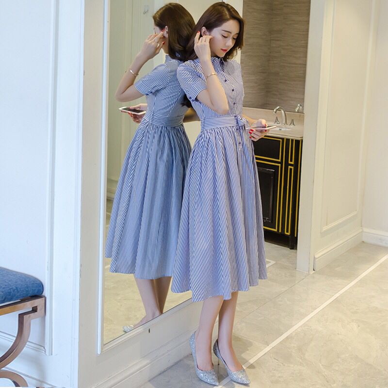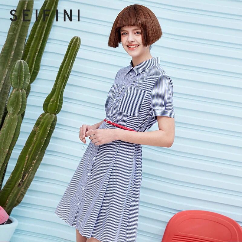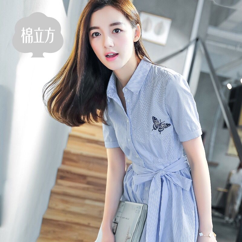 文艺小清新气质条纹衬衫连衣裙,短袖透着一丝清爽的气息,同时衬显手臂纤细修长,条纹简洁优雅,融入进裙装设计,紧随潮流,天然的修饰能力,让裙型更出众。