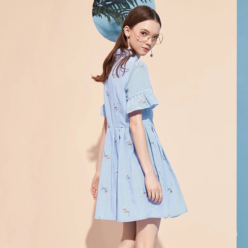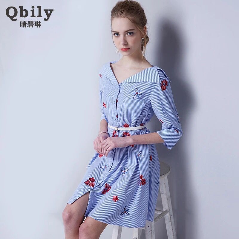 纯棉条纹衬衫连衣裙,配色字母绣,配上栩栩如生的蝴蝶,自在文艺。固定在腰间的本布腰带,既能在装饰衣服的同时,更修饰着装者的形体。