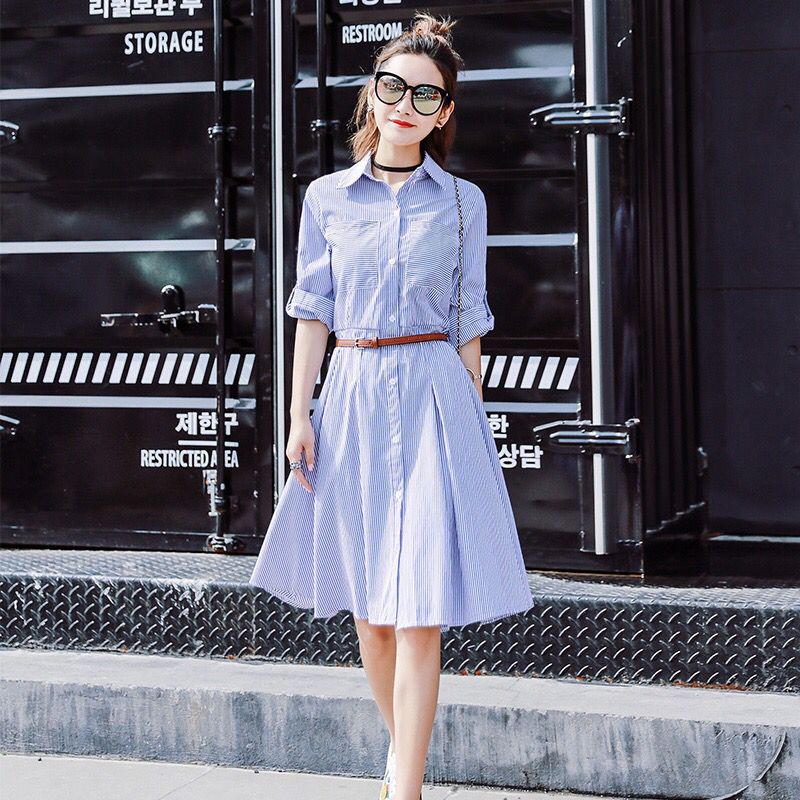 港味小清新衬衫条纹连衣裙,清新的蓝白条纹,还有超大的口袋装饰,增加了趣味,腰间搭配亮色系腰带,展现完美腰部线条。