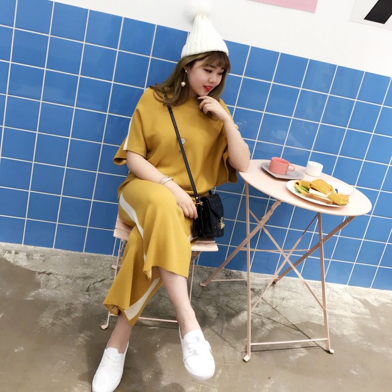 ◆一套时尚感十足的套装,宽松卫衣搭配高腰阔腿裤,效果竟然意外的好,针织材质穿起来非常舒服,宽松的版型,绝对是遮肉的利器,超级适合还胖宝宝们,裤腿两侧竖条纹的设计,时尚感十足。
