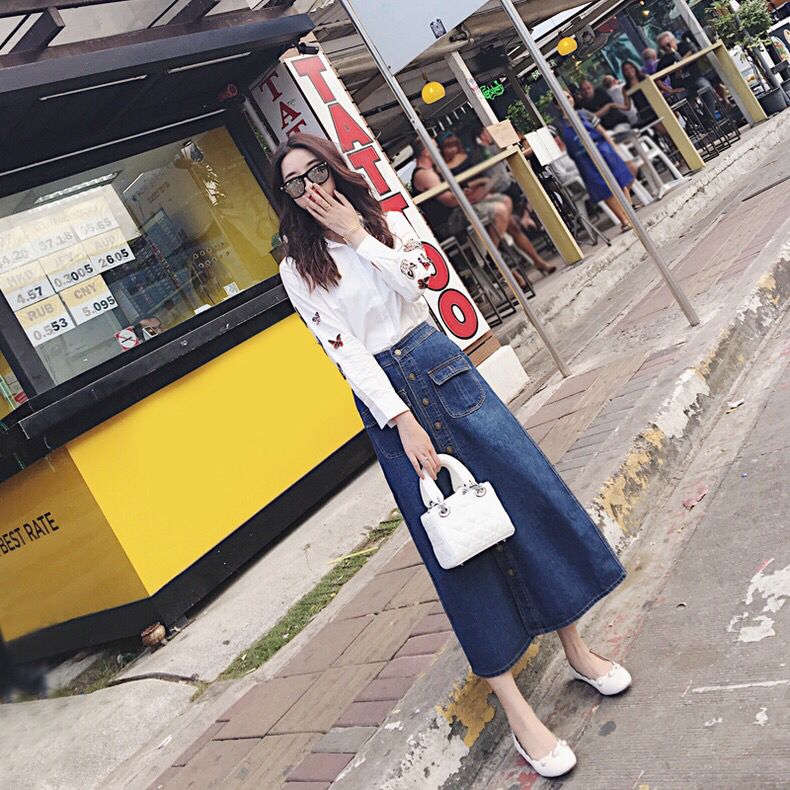 经典的牛仔面料结实耐磨,高腰的设计更加凸显腰身。宽松的A字裙摆能够很好地遮盖臀部和大腿的缺陷,深蓝的配色更加显瘦好搭配。