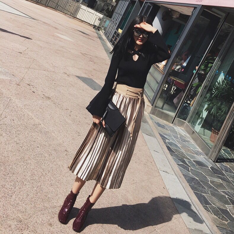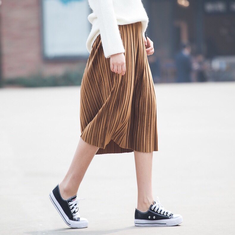 宽松的裙摆能够很好地遮盖臀部和大腿的缺陷,尤其适合大腿粗壮的妹纸们,经典的百褶压褶处理更加优雅随性,卡其色的配色也十分复古时尚。