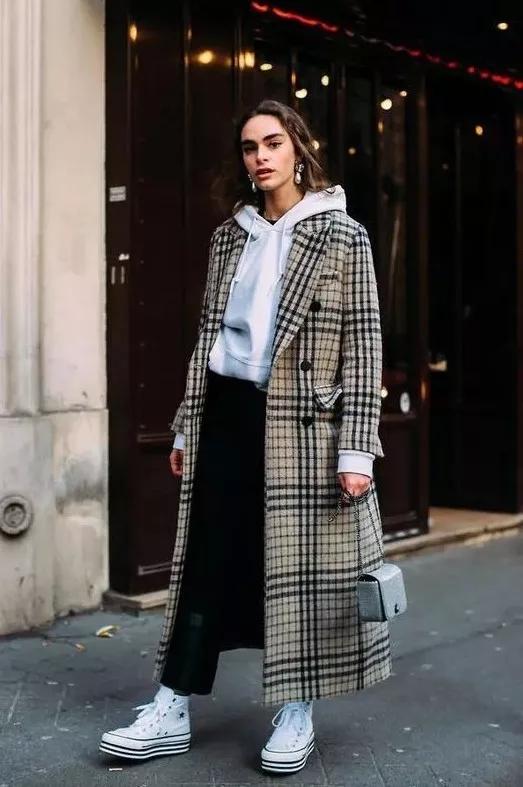 大衣和运动鞋搭配在一起给人一种不协调的感觉,而且成熟风和运动风二者的结合不是人人都可以驾驭的,一般女性也穿不出模特的时尚感和潮流感。长款大衣+平底帆布鞋不仅拉低了腰线,并且腿线也被淹没,像是把人装在了麻袋里,显矮不说还显臃肿。运动鞋本就彰显人的休闲风格,和成熟大衣二者结合,给人一种很不正式、很土的感觉,并不能突显优雅气质。