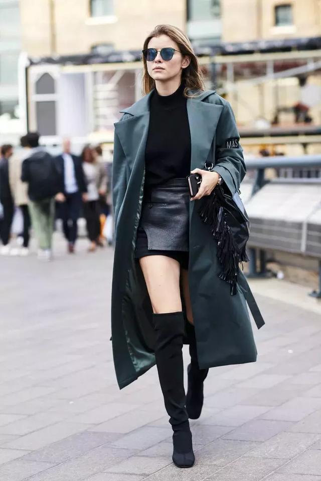 搭配大衣若搭配靴子来增加气质,建议选择过膝长靴来拉高身材比例,视觉上产生腿长一米八的效果。过膝长靴不论对高子高的女性还是个子矮的女性都很友好,个子高的女性选择过膝长靴搭配大衣时,可以采用今年最热的下衣失踪法来拉高腿线,并修饰腿部线条,气场十足;个子矮的女性可以选择高跟的过膝长靴,可以拉伸比例显得腿长一点,搭配大衣显瘦又显高,时髦但是不失成熟。