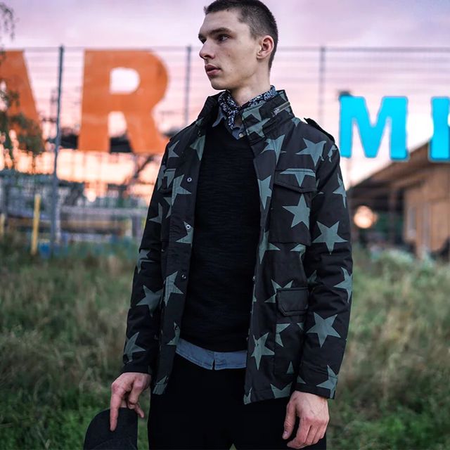 立领设计的一款时尚外套,外套上都是简单潮流的星星印花,短款的版型设计很修身。立领上的拉链设计很精致帅气,简单却不失时尚感。