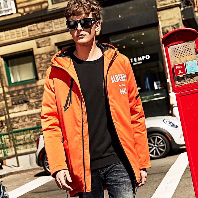 橘色是很鲜艳的一种颜色,这款简单的款式就是用橘色设计,增加了一些潮流与个性,连帽的设计很休闲又舒适。羽绒服的面料很保暖也很舒适,简洁大方。