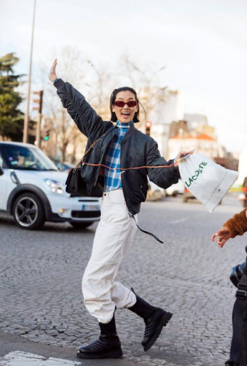 作为一个时尚圈的人,当然要将当下最流行的元素穿上身咯。穿衣技巧。短款飞行夹克再次爆火,黑色款比常见的绿色款百搭一些,内搭蓝白格子高领衫凸显反差萌。下半身搭配一条浅色工装裤与马丁靴,女孩子也可以很帅气。