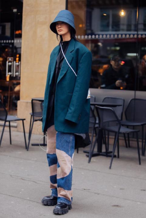 蓝色系西装少了一份正经和拘束,多了一份年轻人追求的新奇与神秘。第一眼看这套搭配就会被这满眼的蓝色给吸引,牛仔裤上的印花也是个性十足。整套搭配看起没有逻辑和章法,可总有股奇怪的冲动,让人忍不住去get同款。