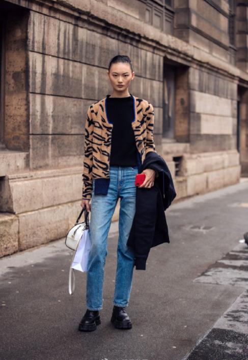针织衫与牛仔裤的组合已经算不上新鲜了,但是模特就有能力把它玩出新花样。豹纹款针织衫有着普通款没有的野性魅力,紫色的描边与焦黄色的混搭出神秘感。下半身搭配一条直筒牛仔裤,整套搭配给人干净利落的感觉。