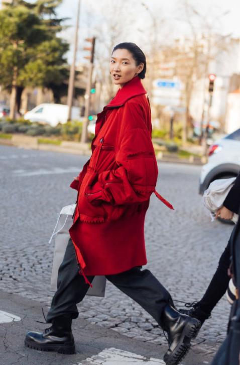 这款红色呢子大衣也就模特可以撑起来了,宽松的款式和拼接款的设计很考验身材。红色系也是当之无愧的抢眼武器,呢子和棉服的混搭凸显满满的时尚感。最后搭配一条工装裤和骑士靴,走路都带风!