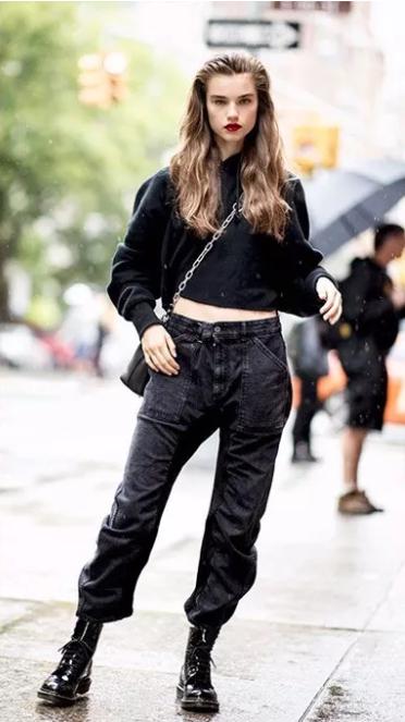 短款的卫衣搭配上收腿的工装裤适合大部分的姐妹,短款卫衣在腰线处贴合线条,不会显得臃肿,就算身上有赘肉也可以被完美的遮盖住,工装裤在遮盖赘肉的同时也可以修饰身材,让身材看上去更苗条,再配上一双马丁靴,将脚踝收紧后,整体的造型有紧有松,显得日常百搭,但依旧充满个性和时尚,而且偷偷告诉你,这种搭配可是适合所有身材的姐妹哦。