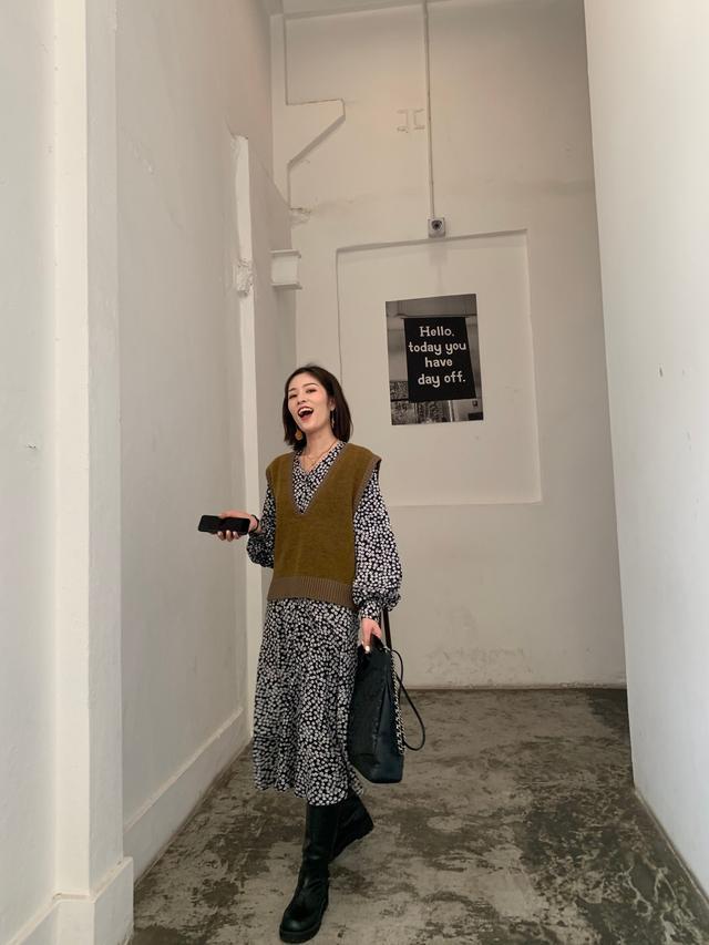 马甲的v领设计让它成为了碎花裙最好的陪衬,相信穿过碎花裙的女生都会有同样的感觉,就是碎花用在连衣裙这样大面积平铺的单品上时,如果单穿就会让人看起来眼花缭乱,没有重点!这时外套一件马甲,就让视线集中在了上半身,V领的设计将脖颈的线条展露无遗,既不喧宾夺主又能提亮整个造型,可谓两全其美啦!