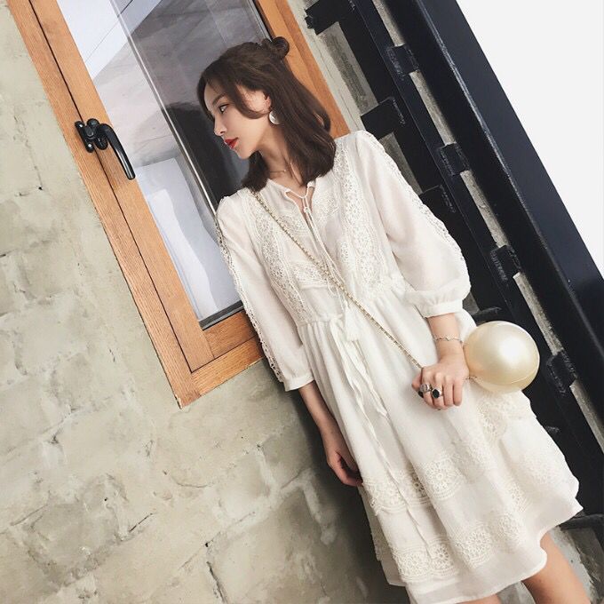 镂空系带白色雪纺连衣裙。层层叠叠的设计,让连衣裙多了层次感,白色的它淡雅低调,穿在上身格调满满,甜美可爱的连衣裙加入了领口处的系带元素,给人仙气逼人的视觉效果。