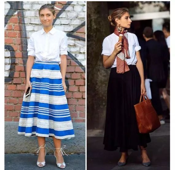 2.我发现jenny在很多街拍都选择了迷笛裙,白衬衫束在腰间,无论搭复古格纹裙还是精致印花长裙,都超级显气质,最重要的是鞋子最好跟裙子同色系哦,这样会在视觉上拉长比例呢,并且显高。