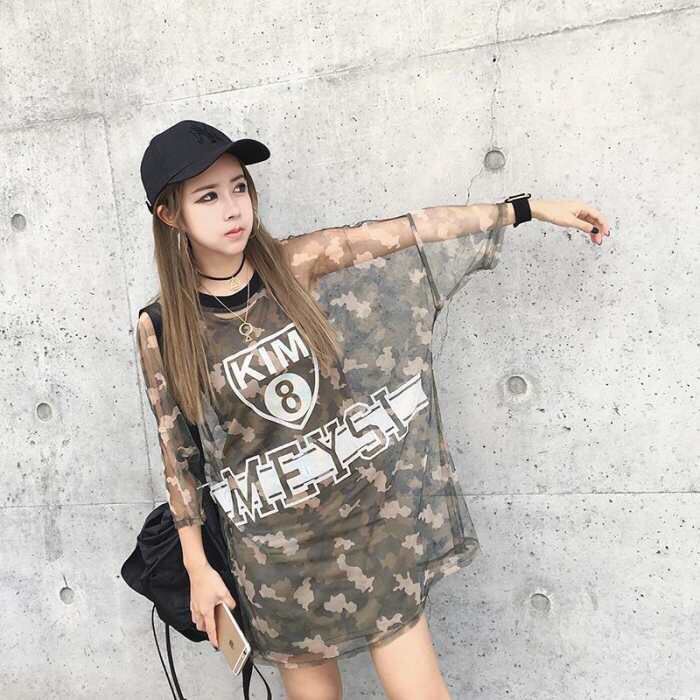 休闲帅气的迷彩两件套,外层的网纱材质轻薄透明,内层做了吊带的内衬,更加舒适防走光,胸前的字母印花结合罗纹的收口,满满的运动感。海风一吹长裙飘扬 ,你就是吸睛女王