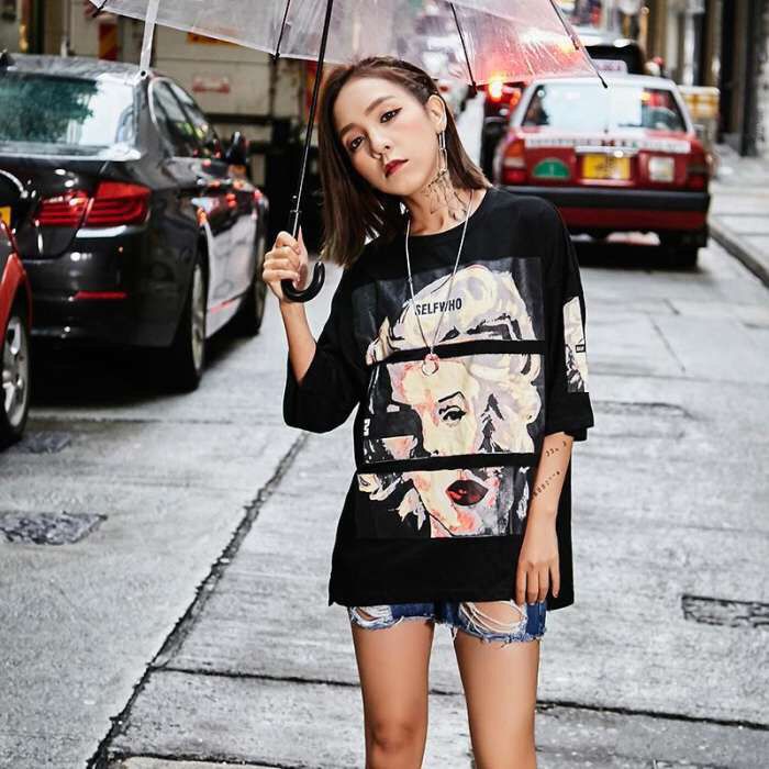 宽宽大大的BF风短袖T,街头范儿十足。夸张超大的梦露人脸印花,极具个性。贴布的中袖设计,和中长款的衣长,有嘻哈的街头感,也可以塞进裤子里穿,显腿长。