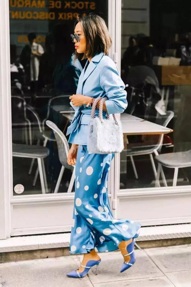 波点裙也有众多选,黑白相间、红白相间等等,春景怡人,你也可选择一条蓝白相间的波点裙,连衣裙半身裙均可。系带款小西装+蓝色波点裙+蓝色高跟鞋,从上至下,颜色由浅至深,打造出层次感和比例,既有天蓝的豁然开朗,又有海蓝的深邃美感,神秘而又高级。