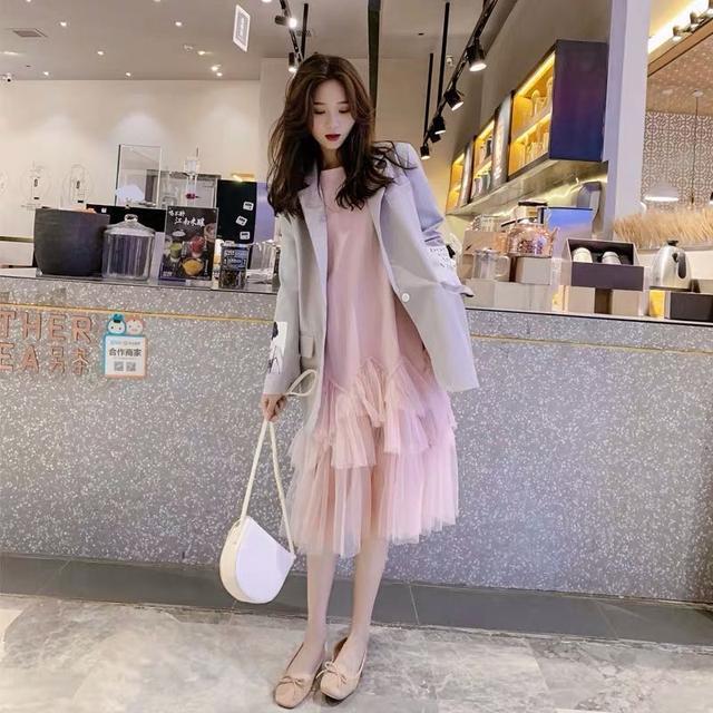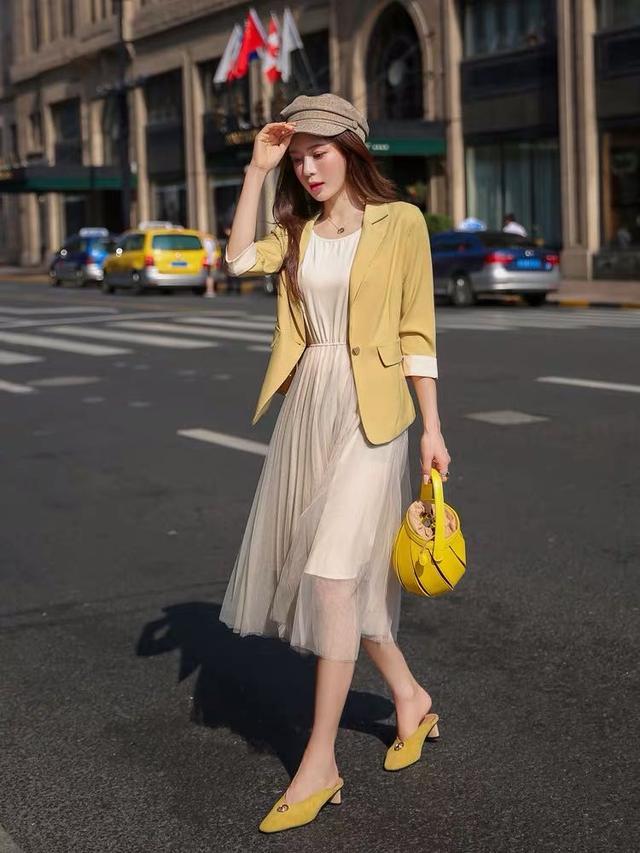 如上图所示,当你穿着一件灰白基础色系的小西装时,内搭的连衣裙可以选择彩色列,低饱和度的配色更适合春季。在材质上可以选择轻纱和雪纺材质的款式,更为灵动飘逸,有种优雅的仙女气质。