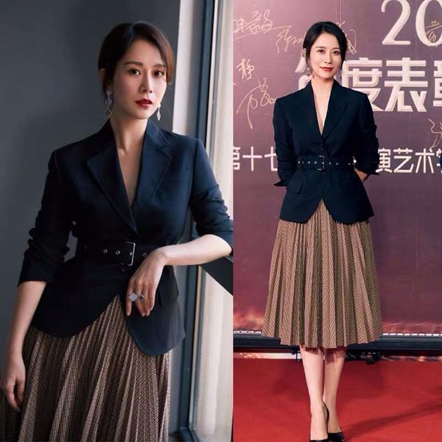 小西装和半身裙的穿搭,层次感上不用过多考虑,唯一要注意的就是比例的打造。短款的小西装,搭配及膝半身褶裙,再系一根腰带,在视觉上形成了规律的黄金比例,腰身、高个和长腿的效果都能显现。如上图所示,黑色小西装+棕褐色百褶裙,端庄优雅,格子元素彰显简约中的经典,颇具东方美女的智慧和典雅。