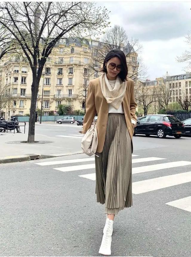 如果要我选择一款裙子,我会选择半身百褶裙,既可以彰显优雅气质,又可以发挥版型优势修饰腿型,美搭效果和实用性兼具。基础色的小西装和百褶半身裙一起搭配,内搭和鞋子用白色点缀出亮点,小西装搭配裙子的图片活力又减龄。为了增加优雅度和气质感,可以用薄款的围巾,绕在脖间系出造型感,颇具法式风情。