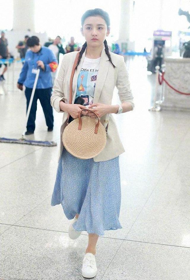 更为安全的组合,还是上装用基础色,下裙用彩色系,让你应景出彩的同时,又能百搭不出错。如上图所示,象牙白色的小西装,内搭纯白色图案T恤,青春感十足,减龄显活力。下穿蓝色印花半身裙,脚踩小白鞋,整体穿搭示人以清爽,十分养眼,分外怡人。