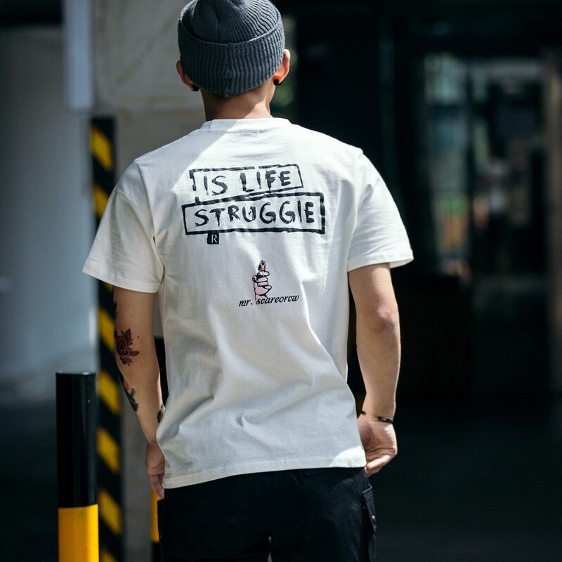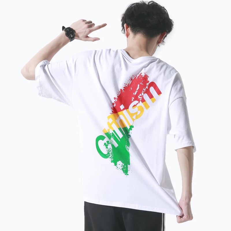 极具设计感的T恤,黑色和白色两种,任你选择。后背上的设计是一大亮点,类似中国的泼墨技术,搭配创意无限的字母印花,仿佛置身于欧美街头。前面的缩小版的设计和后辈呼应。每一处细节,都是经过仔细的考究。