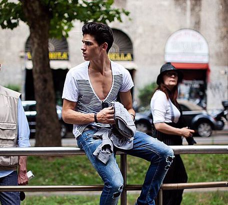 T恤加牛仔裤,是广大直男一年四季最常见的搭配方式。不过不是什么T恤都能单穿的。像这样的深V领T恤,是为了给衬衫打底的时候,不至于在脖子上露出来。所以深V领T恤不能单穿的,是一种内衣。真不知道是哪一个坑爹的厂商,生产出这种不明所以的T恤。