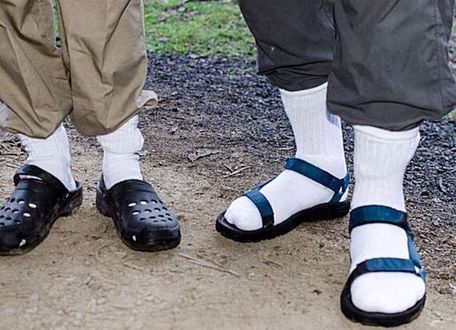 凉鞋配袜子的情况,其实并不少见,尤其是秋季的时候。街边悠哉闲逛的大叔们,最流行的装束莫过于凉鞋配上白袜子了,看了还是知道冷的。可是既然都知道冷了,就不能好好穿一双鞋子么?一定要用凉鞋配白袜才够拉风?