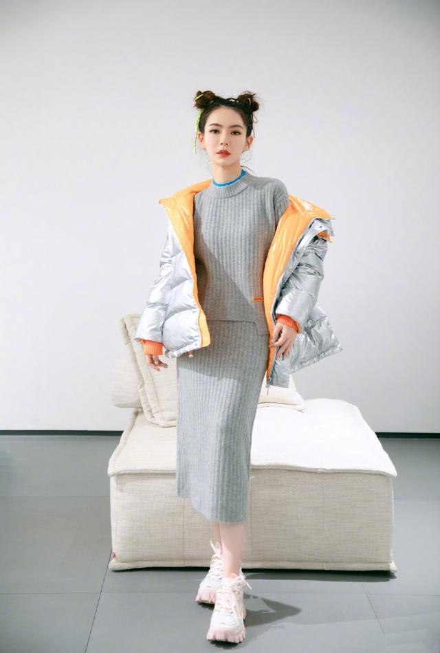 戚哥用裙子搭配蓬松的羽绒服已经不止一次,但每次都有不同的美感,看起来十分暖和时髦,上镜亦是十分的时尚高级。但是请注意了小姐姐们,内搭的裙子尽量采取贴身的款式,修饰出良好的身形,与宽松的羽绒服相互映衬保持平衡,并且裙子的长度尽量选择比羽绒服稍长。羽绒服的色彩选择温柔的白色、优雅的黑色与高级的银灰色,让整个人高级又时髦,此次戚哥用银灰色的短款羽绒服搭配灰色针织打底衫,加上具有活力的橙色内衬和丸子头,让她减龄又时髦,还不用担心冬季的寒风。