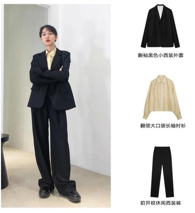 黑色翻袖西装外套是比较有仪式感的时装,所以经常会被用在各种的场合,里面搭配一件长袖衬衫,衬衫上有大口袋的设计看起来非常的大气。裤子搭配一条前面开叉的休闲西裤,西裤虽然比较严谨,但是开叉的设计却和时尚挂边,是有自我风格且非常不羁的西裤,所以这种搭配更加适合比较独立且有想法的年轻女性。