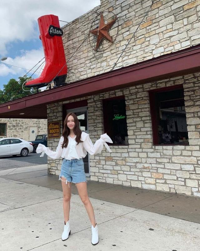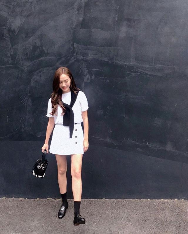 首先还是来说一下最经典的黑白色搭配,在这身穿搭中,郑秀妍选择了一件白色的连衣裙,较为宽松的款式加上腰部收紧的设计,使整个人看起来非常的舒适,但是身体线条又很强。而因为身体选择了纯白色的连衣裙,所以在腿部上就不适宜做过多修饰,而她这时就将黑色的元素运用在了身体的两端,分别是脚部的位置和肩膀的位置。首先脚部选择纯黑色的皮鞋和纯黑色的袜子,而肩膀选择了纯黑色的针织衫,做成披风的感觉,通过黑、白、黑的顺序进行一个搭配。