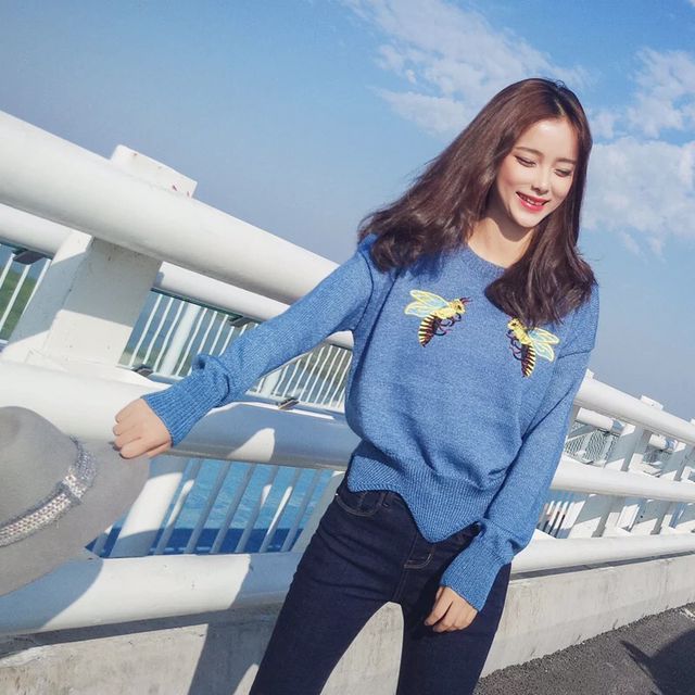 很是清新甜美气质的一件短款毛衣,耀眼的蓝色,有着很可爱的小蜜蜂刺绣,迷人小巧。下摆处的波浪纹设计,与众不同,很是吸睛哦。