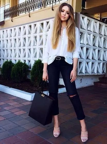 接下来划重点了!什么样的裤子穿着会超级漂亮呢!就是像这样的,较为宽松的直筒牛仔裤,有破洞也是很好看的哦!