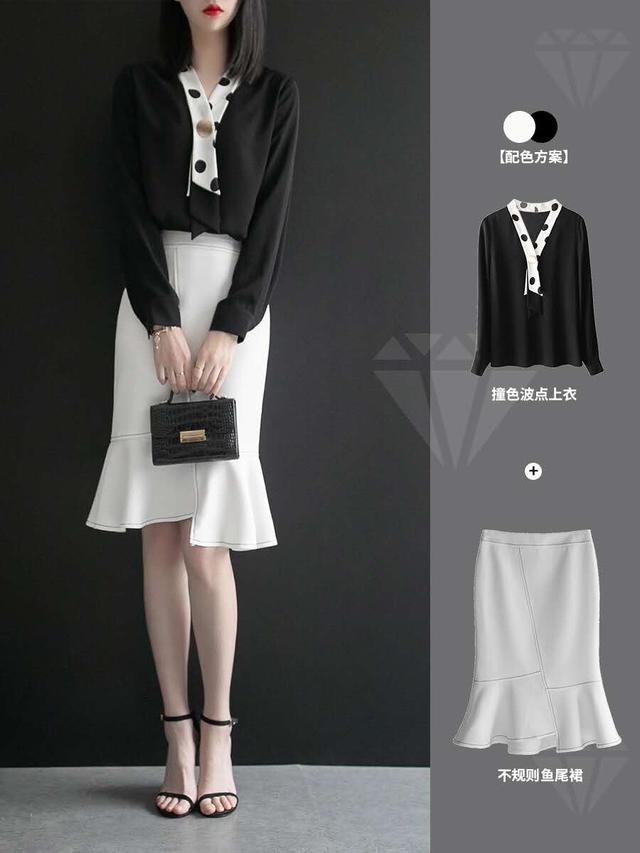 黑色衬衫领口做了一个撞色的波点设计,让优雅的女性多了一份俏皮可爱感,配上白色不规则鱼尾裙,经典的黑白配显得大气高贵。裙摆是不规则的设计,让半身裙多了其它几分可能性,俏皮、可爱、性感、优雅都是它的魅力。
