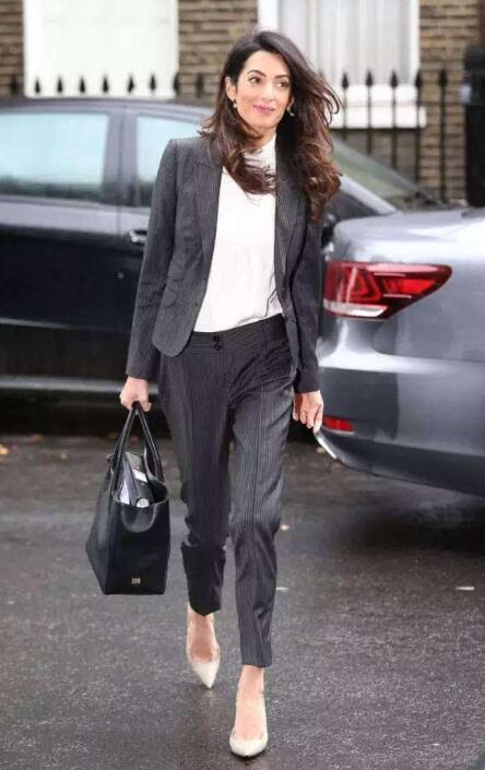 看着所有的搭配都很时尚,适合在外面工作的白领,裤子看起来腿又细又长很漂亮。上身穿一件白色衬衫,外面穿一件深蓝色的垂纹小西装,下身穿一条与外套图案相同的烟服裤,脚上穿一双白色高跟鞋,手上穿一个黑色的包,说明整个人成熟稳重。