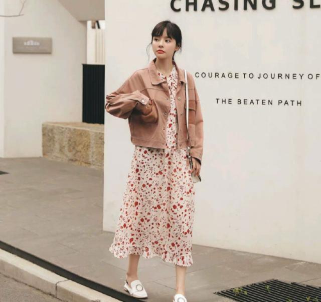 大家之所以喜欢在春秋这种季节里穿碎花裙,有很大的一个原因就是很好搭配,不论是单穿,还是搭配外套,都很时髦简约。白色打底作为衬托,红色不规则印花相间,看上去很是独特闪眼,一点都不会觉得繁琐,再搭配一款藕粉色的夹克短款外套,看起来更清新乖巧一些。这种碎花裙的搭配风格很适合学生党女孩,既不浮夸张扬,又不会失去存在感,搭配帆布鞋或者小皮鞋都好看。