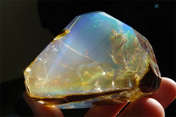 蛋白石,由二氧化硅组成的水合物,呈现透明/半透明质地,其色泽透亮,当阳光照射时,能够显现出彩虹般的光泽,十分精美。因为其主要成分为硅酸化合物,为非晶体结构,因此在外形上不固定,在断口处呈现贝壳状。比较出名的有“树化玉”、“螺化玉”,都是二氧化硅沉积出来的蛋白石。