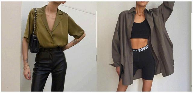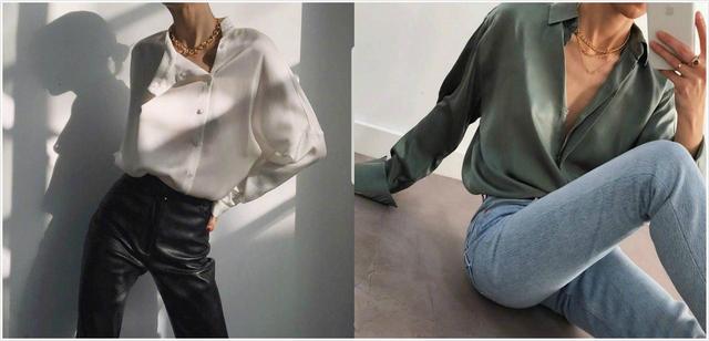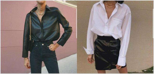 Petra偏爱质感性强的衬衫,譬如第一件面料是皮革质的,无论从观感、还是触感,都显得十分轻奢高级,这类面料的衬衫,建议选择袖子相对来说更贴肤的,领子也开到锁骨处的,并且稍微立起领子,下身再搭条高腰牛仔裤,尽显帅女孩风范。如果喜欢穿皮裙的女生,建议与白衬衫组合,简约又时尚。