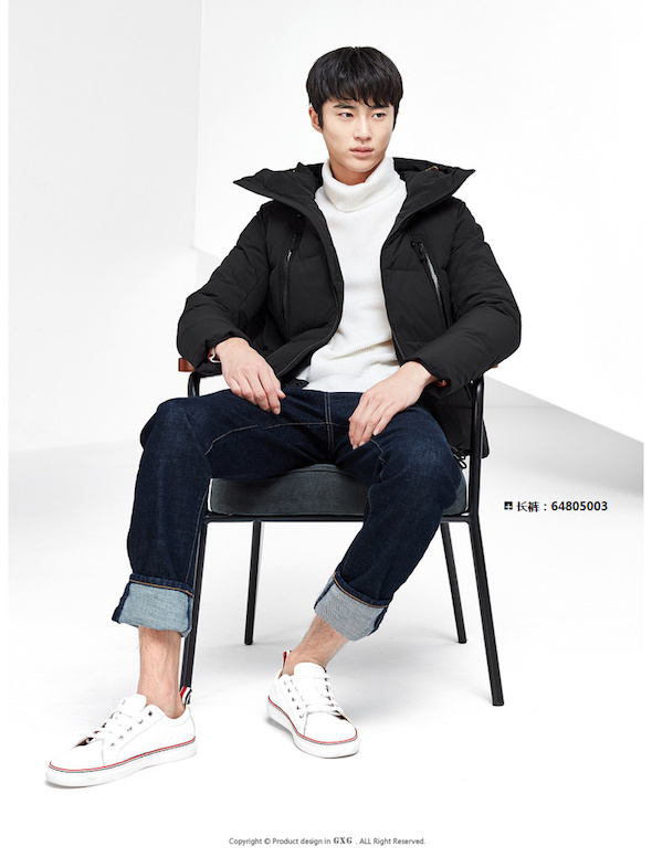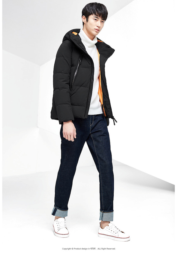 2.冬装男装搭配同色系的修长牛仔裤,让整体造型和谐统一,一身黑色的装扮再萧瑟的冬日显得十分有范儿,深色系的短款羽绒服给人沉稳的感觉却不沉重。搭配上高领白毛衣再加一双小白鞋,洁净大方又气质温和。