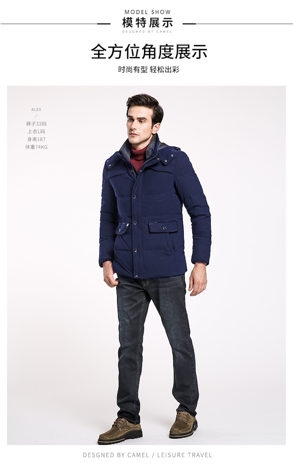 3.围脖式帽子保暖度十足,羽绒服可以选择到跨部的短款,并且带有一定设计感,否则加长加厚的羽绒服虽然足够温暖,但是如果个子不够高也会让你看起来像是校园大门口的保安大叔。机车夹克男装冬季搭配,穿出高挑身材的风格之
