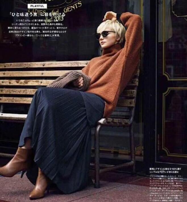 有些女人们可能觉得选择纯色系的单品太过于简单,那么我们也可以选择一件简约的棕色针织衫作为上衣,搭配一条花色系的大摆裙,这样也能够散发出你的个人魅力。裙子选取一些特殊花纹的设计款,这样会让你整个人看起来更加独特有女人味,配上一双深灰色的裤袜,再搭配一双尖头高跟鞋,能够使你的身材更加修长,并且会让气质更好的散发出来。