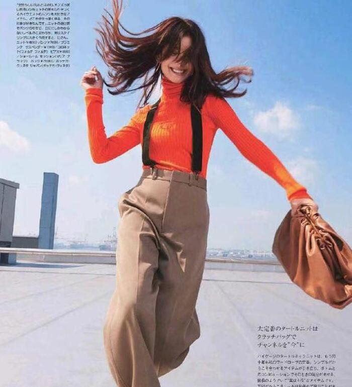 棕色系的阔腿裤有帅气感,我们可以选择一个黑色的简约肩带,构成一种背带裤的穿法。搭配一件亮眼的橘色针织修身毛衣,给人一种年轻靓丽的感觉,这样的穿搭让整个人看起来更加有活力。